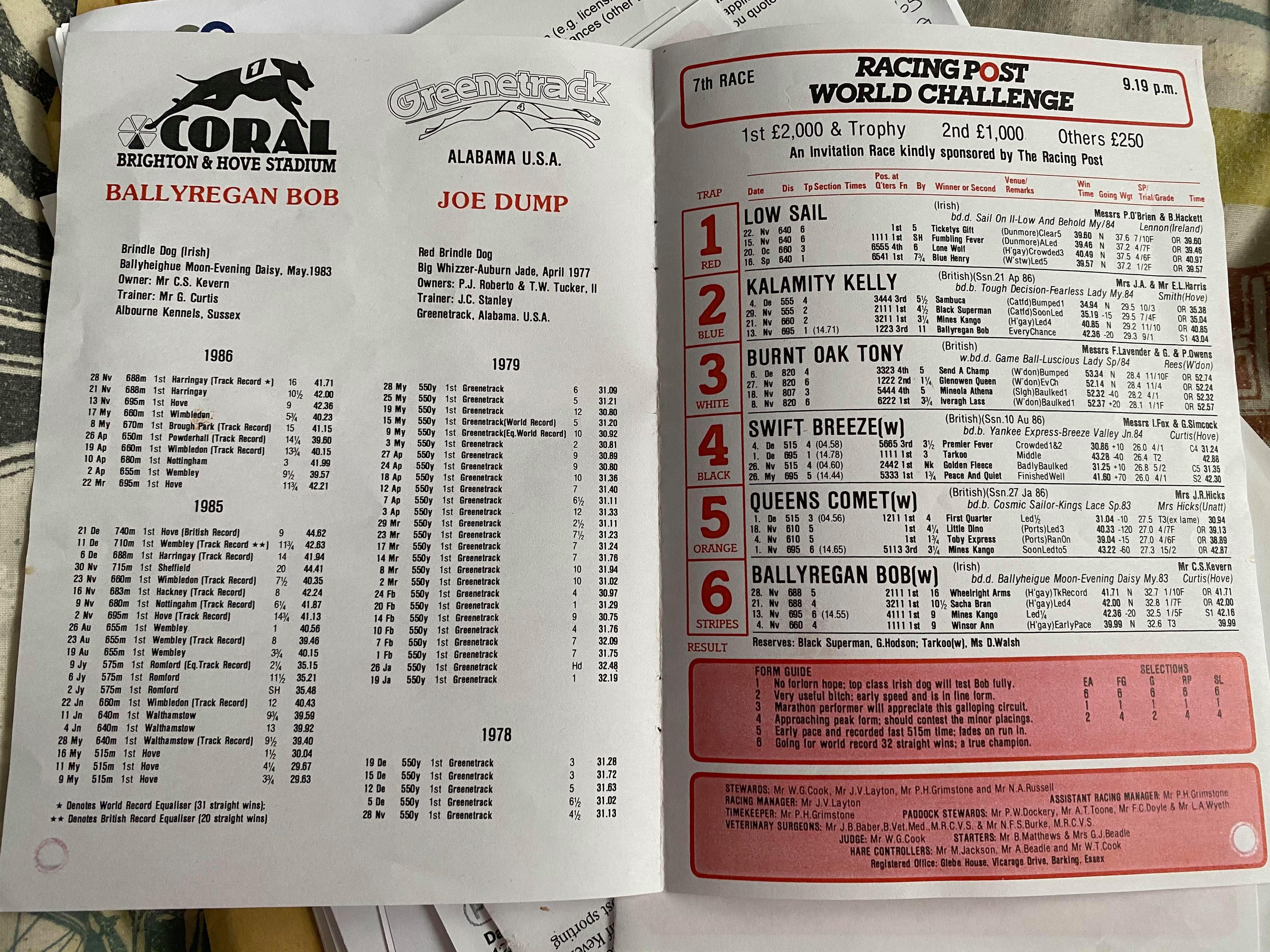 BALLYREGAN BOB: The souvenir racecard for Ballyregan Bob's history-making 32nd win in the1986 Racing Post World Challenge over 695 metres at Hove.
