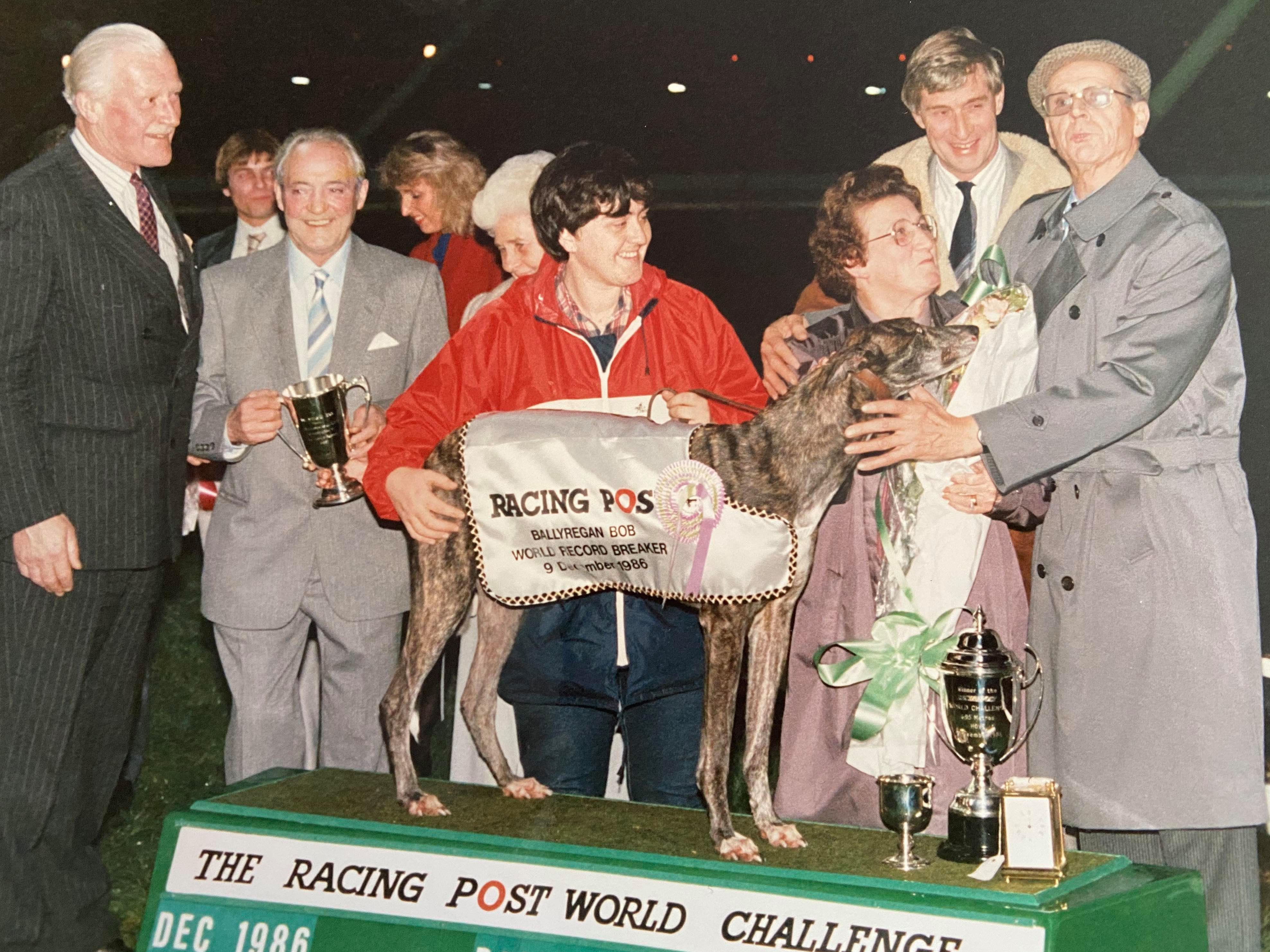 The track career of Ballyregan Bob culminated with an historic win on home soil in front of 6,000 fans in the £2,000 Racing Post World Challenge over 695 metres on December 9, 1986, when he notched up his 32nd successive win to surpass American champion Joe Dump’s world record sequence.
