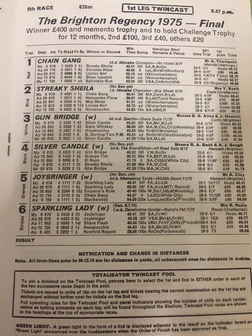 THE RACECARD FOR THE 1975 REGENCY FINAL AT HOVE: Glin Bridge reigned supreme in a memorable final before 4,500 spectators and later defeated runner-up Streaky Sheila in a special 'match' race at Hove.